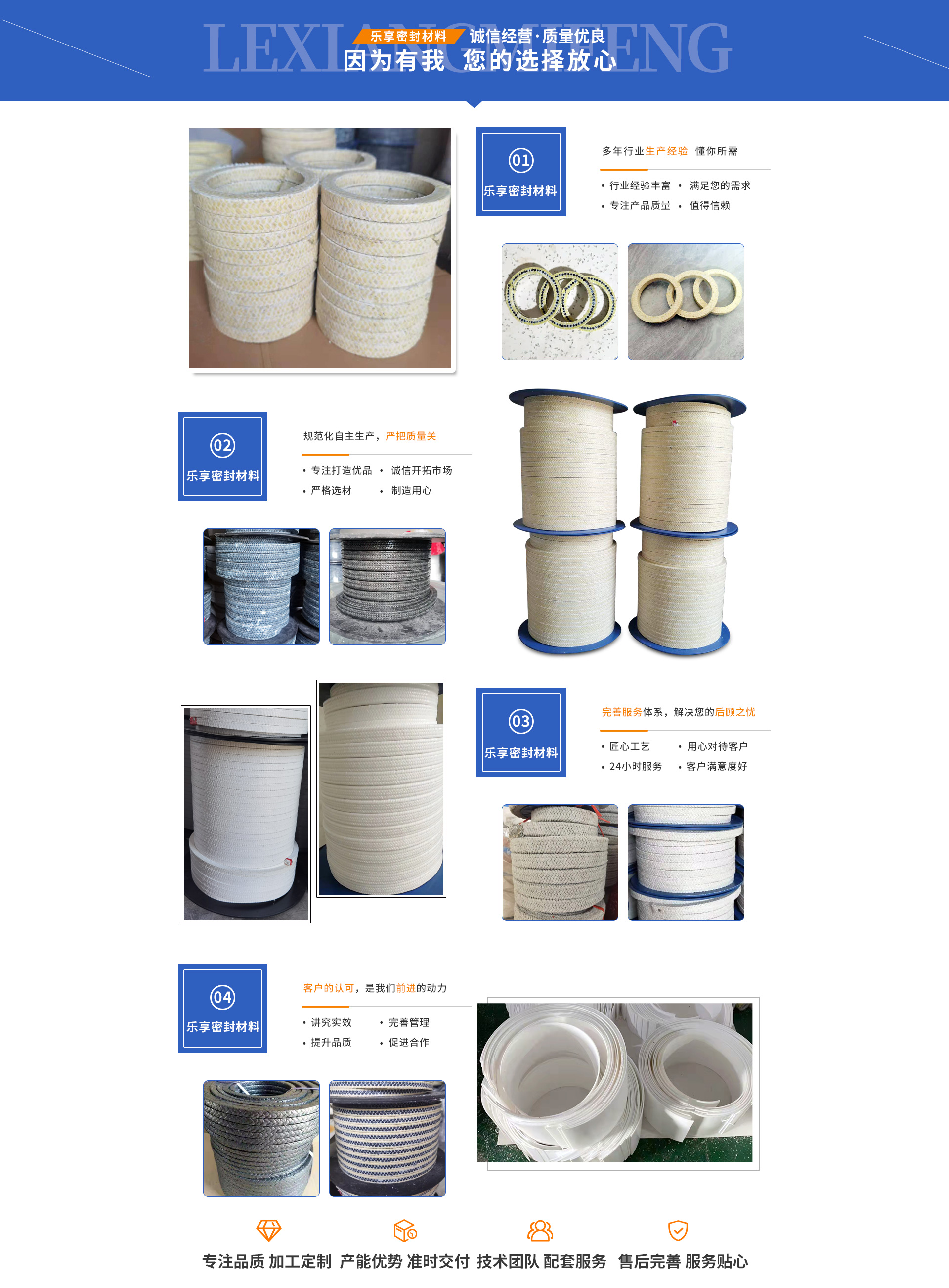 大城縣樂享密封材料有限公司主營:芳綸盤根,四氟盤根,碳素盤根,石棉盤根,芳綸墊片,石棉浸液盤根,芳綸盤根墊片,無油白四氟盤根,含油白四氟盤根,含油黑四氟盤根,石棉含油盤根,芳綸碳素盤根,石棉橡膠盤根,芳綸碳素混編盤根、聚四氟乙烯板(四氟板)等,是生產銷售密封件的廠家,廣泛應用于石油、化工、造紙、造船、發電、冶金等工業設備的管道、閥門、法蘭、換熱器等。